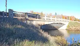 The bridge carrying M-28 over the Sand River is a medium-span concrete bridge 56 feet (17 m) long and 40.4 feet (12.3 m) wide supported by concrete abutments. The span has a shallow arch, 4 feet (1.2 m) thick at the abutments and 1 foot 8 inches (0.51 m) at the center of the span. It has a so-called rigid-frame construction, which was a new development by the highway department at the time the bridge was built. The bridge has concrete and steel guardrails and horizontal Art Moderne scoring on the sidewalls of the abutments.[2] Despite its age, the bridge remains in excellent condition.[2]