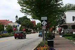 The trunkline curves to the northwest around Bronner's Christmas Wonderland, which bills itself as the "World's Largest Christmas Store"; the store has 7 acres (2.8 ha) under one roof devoted to Christmas merchandise.[5] Further north, M-83 follows Main Street over the Cass River into downtown Frankenmuth. North of the river are Zehnder's and the Bavarian Inn, restaurants known for their "world famous" chicken dinners. The city is known as "Michigan's Little Bavaria"; the area was settled by German Lutherans in the 19th century.[6] Today, buildings and even road signs are erected in the Bavarian theme.[7]