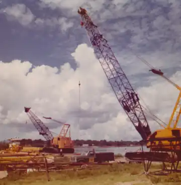 American cranes, service truck from M. D. Moody and a MOBRO tug and barge in 1976.