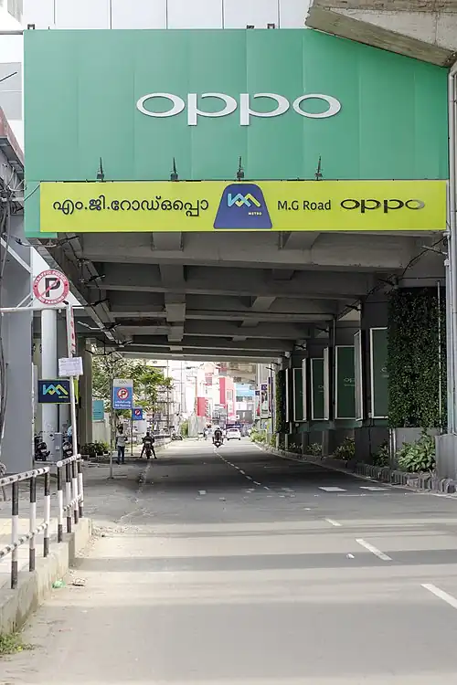 M. G. Road is a station of Kochi Metro. It was opened on 3 October 2017 as a part of the extension of the metro system from Palarivattom[1] to Maharaja's College.[2] The station is located between Town Hall and Maharaja's College.[3] The name of the station refers to Mahatma Gandhi Road. It is also located at a distance of 1.3 kilometres (0.81 mi) from the High Court water metro station.