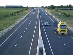 Construction of this 16 km (10 mi) scheme started in December 2007. The section opened to traffic on 25 May 2009, some nine months ahead of the original target completion date.[19] Like the Cashel-Cullahill project, the Fermoy-Mitchelstown scheme was redesignated a motorway during its construction, having originally been envisaged as a HQDC.[20] It was built by Roadbridge Ltd. at a cost of €174 million.[19][21]