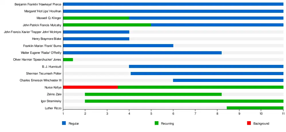 | Margaret "Hot Lips" Houlihan (Penobscott) | Loretta Swit | Major | Head Nurse | 239 |