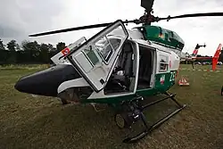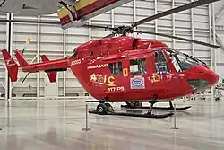The MBB/Kawasaki BK 117 is a twin-engined medium utility–transport helicopter. It possessed several attributes that lend itself to performing many different roles, such as twin-engine redundancy, sizable clamshell-shaped rear-facing double doors, and a relatively spacious cabin; one mission to which it was deemed to be suitable was the emergency medical services (EMS).[10] The airframe is composed of rivetted metal, making minimal use of composite materials, in order to free up internal space, both the engines and transmission are positioned above the main cabin. Considerable efforts were made to reduce the weight of the aircraft where possible albeit without compromising the aircraft's structural integrity.[3] The cabin could be configured with various interiors in order to suit its purpose.[11]