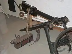 Between 1891 and 1894 Switzerland procured 72 heavy machine guns, designated MG 94,[1] from Maxim and Nordenfelt in London.[2] These weapons were issued to fortress troops[3] and mountain troops and were operational until 1944 as spare arms with the Territorial Battalion. The MG 94 was mounted at the front end and at the rear on the knees of the gunner. Two leather padded rings on the left and on the right sides of the breech of the weapon rested on the knees of the machine gunner sitting behind it and permitted sweeping fire. The machine gun MG 94 was chambered for the 7.5x53.5 mm GP 90 cartridge and was later, along other minor technical modifications, adapted for firing the more powerful 7.5x55 mm GP 11 cartridge. Six MG 94s had their water-cooling mantles drilled and cut open, making these guns air-cooled and thus water-free and lighter for use as aircraft machine guns. These six MG 94 air-cooled guns were taken out of service in 1944.