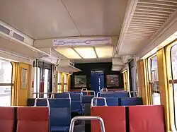 As delivered, the MI 79 had an interior design in keeping with the aesthetics of the time, including red and blue vinyl seats, cream-colored ceilings, yellow side walls, and dark blue end walls. Also, because the RER B would serve Charles de Gaulle Airport, trains were equipped with luggage racks above the seats.[3]