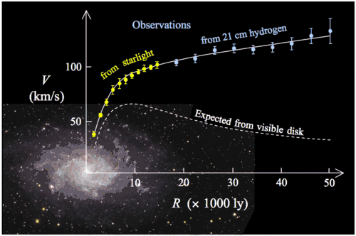 (1) There are large quantities of unseen matter in galaxies that boost the stars' velocities beyond what would be expected from the visible mass alone, or (2) Newton's Laws do not apply to galaxies.