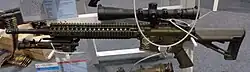 The Squad Designated Marksman Rifle (SDMR) is a mid-length carbine similar in configuration to the SEAL Recon Rifle. It features a railed upper receiver, a mid-length gas system, a Daniel Defense 16-inch cold-hammer forged barrel, a Daniel Defense free-floating railed handguard, a 4x32 Trijicon Advanced Combat Optic, a Magpul STR buttstock, a Hogue foregrip with a cleaning kit, and a cerakote finish.[9]