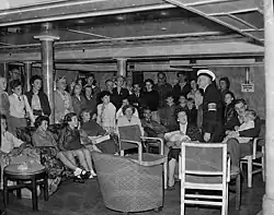 She was built by Harland & Wolff of Belfast, launched in 1948 for the British Transport Commission and started service in 1949.[4] She replaced a smaller 1920 vessel of the same name, the twin screw steamer Cambria, and despite a large size had a reduced maximum speed of 21 knots (39 km/h) compared to 25 knots (46 km/h) of the older ship.[5] In 1951 she was fitted with Denny-Brown stabilisers. In 1964–65 they were refurbished with airline style seating. Some cabins and staterooms were removed and replaced with second-class lounges, and a cafeteria. The screened areas were extended to provide further covered seating, and the first and second class smokerooms were converted into a tea lounge.[4]