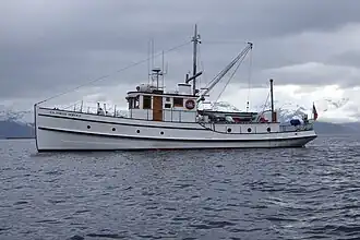 The MV Chugach Ranger is a historic ranger boat whose home port is Petersburg, Alaska. She is the last wooden ranger boat in the fleet of the United States Forest Service operating in Southeast Alaska.[2] She was designed by Seattle-based boat designer L. H. Coolidge and launched in Seattle in 1925. She has been in service ever since, transporting scientists, government officials, supplies, and guests throughout the areas administered by the Forest Service in southeastern Alaska, and performing search and rescue operations. First based in Cordova, she was assigned to the Tongass National Forest in 1953, and relocated to Petersburg. She is about 62 feet (19 m) long, 14.5 feet (4.4 m) wide, and is estimated to displace 40 tons.[3]