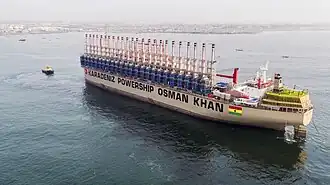 The Turkish company Karadeniz Holding purchased the vessel MV Pacific Triangle at the end of 2014 for US$17 million from Teekay Shipping.[4] The bulk carrier was converted into a Powership with a generation capacity of 470 MW at Hat-San Shipyard in Altinova, Yalova. On November 13, 2016, the Powership, renamed MV Karadeniz Powership Osman Khan, sailed to Ghana in a ceremony attended by the President Recep Tayyip Erdoğan, Prime Minister Binali Yıldırım, Minister of Transport, Maritime and Communication Ahmet Arslan and other officials. She was commissioned to supply electricity to the power grid in Ghana.[5] She is the world's biggest Powership.