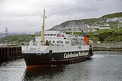 MV Iona (VII) was the first of a new generation of major car ferries built for the Scottish Transport Group to replace the ageing 1939 mailboat Lochiel, serving Islay, Jura, Gigha and Colonsay from West Loch Tarbert.[1] Early in 1968 MacBraynes were authorised to order a large new car ferry for the Argyll Hebrides and placed an order with the Ailsa yard in Troon. The deep-drafted vessel could not operate from MacBrayne's existing West Loch Tarbert pier and a site at Redhouse, much further down the loch was identified. In January 1969, Argyll County Council announced that they would not proceed with works at Redhouse. As the alternative route from Oban was too long, the entire scheme was abandoned in August 1969. Instead, the hoist-loading MV Arran, one of the pioneering Clyde car ferries replaced MV Lochiel at Islay, competing with Western Ferries.
