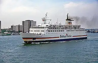 She was built in 1978 as the Prinses Beatrix by Verolme Shipyard, in Heusden, the Netherlands and worked for Stoomvaart Maatschappij Zeeland on its joint Sealink route between Hook of Holland and Harwich, Parkeston Quay. She was named and launched by Princess Beatrix on 14 January 1978.[1] Brittany Ferries bought the vessel on 1 October 1985 and, after chartering the vessel for a year back to SMZ, renamed her Duc de Normandie, operating between Portsmouth and Ouistreham from 5 June 1986.[2] The ferry sailed alongside Reine Mathilde on its favoured route to Ouistreham. On 10 July 2002, she was transferred to the Plymouth-Roscoff route, replacing the Quiberon.[3] She ended her Brittany Ferries career on this route, her final sailing being on 30 September 2004.