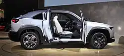 The Mazda MX-30 is a subcompact crossover SUV produced by Mazda and sold as a battery electric (BEV), plug-in hybrid (PHEV) or mild hybrid (MHEV) variant.[5] Based on the CX-30, it was unveiled at the 2019 Tokyo Motor Show.[6] Production of the vehicle, which is Mazda's first mass-produced electric car, began at their Ujina factory on 19 May 2020.[7]