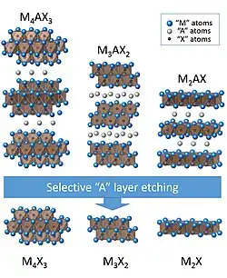 MXenes adopt three structures with one metal on the M site, as inherited from the parent MAX phases: M2C, M3C2, and M4C3. They are produced by selectively etching out the A element from a MAX phase or other layered precursor (e.g., Mo2Ga2C), which has the general formula Mn+1AXn, where M is an early transition metal, A is an element from group 13 or 14 of the periodic table, X is C and/or N, and n = 1–4.[4] MAX phases have a layered hexagonal structure with P63/mmc symmetry, where M layers are nearly closed packed and X atoms fill octahedral sites.[2] Therefore, Mn+1Xn layers are interleaved with the A element, which is metallically bonded to the M element.[5][6]