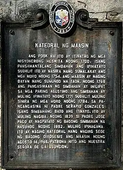 Early records indicate that Maasin is one of the oldest towns in Southern Leyte. When the Spanish missionaries arrived there, they found the native population to be relatively organized, friendly and interested in the Catholic faith.[2] The Jesuits were the first order to formally establish a parish in the community in the 1700s. A piece of stone from a destroyed convent bearing the inscription "Pa. De Tagnipa - año 1776." authenticates the establishment. The ruins exist until the present time, lying between the border of Abgao and Mantahan districts.