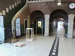 Due to the fortified character of the town, the first railway station was in fact situated outside Maastricht, within the municipality of Meerssen. The first station was built out of wood, so that in case of attack it could quickly be demolished. The municipal borders were adjusted in 1907, making the station part of the municipality of Maastricht. The current brick building was built in 1913, designed by George Willem van Heukelom. Due to its international connection, the station housed border customs. Even though Belgian trains from Liège still terminate at Maastricht, passport and security checks have gone with the implementation of the Schengen Agreement. The former customs space is now used for small shops such as a florist, an Albert Heijn, a HEMA, Snackbars, and a Starbucks.