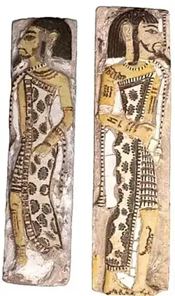 The first ancient Egyptian sources described the Meshwesh men with tattoos and long hair with longer side locks in the front, while centuries later they appear with shorter hair of Egyptian influence but braided and beaded, neatly parted in both sides from their temples and decorated with one or two feathers attached to leather bands around the crown of the head. They still used the same robes as before, a thin mantle of antelope hide, dyed and printed, crossing one of their shoulders and coming down until mid calf length to make an open robe over a loincloth with an adorned phallus sheath, being the only exception of the new addition of a kilt above the knees and an animal tail in the Egyptian manner of king Narmer and the phallus adornment over it. Men wore facial hair trimmed except at their chin and the older men kept their longer chin tufts braided. Women wore the same robes as men, plaited, decorated hair and both genders wore heavy jewelry. Later images showed them to have accepted and adapted some Greek or Macedonian tunics. Weapons included bows and arrows, hatchets, spears and daggers.