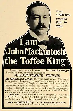 Mackintosh understood the power of marketing and publicity. He began with handbills advertising Mackintosh's Celebrated Toffee as a weekend treat targeting the Saturday afternoon market, when workers had a half-holiday and their weekly wage payment in hand.[3] By 1896, Mackintosh was calling himself the "Toffee King" [2] and his product "The King of All the Toffees".[3] In 1902 the firm began consumer and coupon competitions and then national press marketing: the firm bought space in the Daily Mail, Britain's most popular mass newspaper, and it used story lines, graphics and cartoons, while his competitors still limited themselves to wordy descriptions.[3]