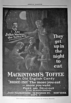 Canada had its own version of Mackintosh's Toffee.[3] Unlike the British versions, it was a hard candy which, for most of its history, was sold as a single rectangular bar in a tartan box. More recently (circa 2008) the Canadian product is individually wrapped and manufactured in Switzerland by Nestlé, and licensed for sale in Canada by Nestlé Canada. However, the wrapped version is soft and more akin to a caramel. Recently (2013) Nestlé Canada has been distributing an apparent recreation of the hard Mack bar, though thinner and wrapped in foil. It contains sweetened condensed milk as a main flavouring and has less of the creamy butter flavour of the original Canadian Mack. Nestlé does not distribute the toffees in the US, but it may be ordered online for delivery or found in specialty candy shops.