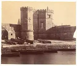 The northern section of Macquarie Street was initially a path through the Governor's Domain leading to Bennelong Point. After Government House was moved further up the hill, the path was widened and became part of Macquarie Street, leading to land to the west of the street being sold off for commercial development in the 1840s–1850s. Today, this northern section of Macquarie Street runs along the eastern side of Circular Quay. To the east of this northern section is the Royal Botanic Gardens, while to the west of the street, the historic sandstone Moore Stairs, built in 1868 leads to the waterfront.[7] In the past, this area was lined by warehouses and other shipping-related facilities focusing on the wool trade, leading to this section being called the "wool stores" end. In 1868 Moore Stairs were built to provide access between these stores down to East Circular Quay.[8] At the end of the street was Bennelong Point. From 1821 this was the site of Fort Macquarie, which in 1901 was demolished to make way for the Fort Macquarie Tram Depot, which was eventually demolished in 1958 to make way for the Sydney Opera House.