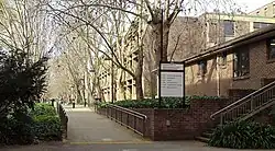 Before the development of the campus, most of the site was cultivated with peach orchards, market gardens and poultry farms.[44] The university's first architect-planner was Walter Abraham, one of the first six administrators appointed to Macquarie University.[18] As the site adapted from its former rural use to a busy collegiate environment, he implemented carefully designed planting programs across the campus. Abraham established a grid design comprising lots of 300 square feet (28 m2) running north–south, with the aim of creating a compact academic core. The measure of 300 feet (91 m) was seen as one minute's walk, and grid design reflected the aim of having a maximum walk of 10 minutes between any two parts of the university. The main east–west walkway that runs from the Macquarie University Research Park to the arts faculty buildings was named Wally's Walk in recognition of Abraham's contribution.[18]