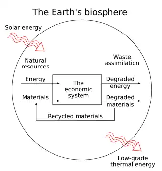 Since the 1970s, various environmental problems have been integrated into growth and other macroeconomic models to study their implications more thoroughly. During the oil crises of the 1970s when scarcity problems of natural resources were high on the public agenda, economists like Joseph Stiglitz and Robert Solow introduced non-renewable resources into neoclassical growth models to study the possibilities of maintaining growth in living standards under these conditions.[7]: 201–39 More recently, the issue of climate change and the possibilities of a sustainable development are examined in so-called integrated assessment models, pioneered by William Nordhaus.[40] In macroeconomic models in environmental economics, the economic system is dependant upon the environment. In this case, the circular flow of income diagram may be replaced by a more complex flow diagram reflecting the input of solar energy, which sustains natural inputs and environmental services which are then used as units of production. Once consumed, natural inputs pass out of the economy as pollution and waste. The potential of an environment to provide services and materials is referred to as an "environment's source function", and this function is depleted as resources are consumed or pollution contaminates the resources. The "sink function" describes an environment's ability to absorb and render harmless waste and pollution: when waste output exceeds the limit of the sink function, long-term damage occurs.[41]: 8 In 2024 a new approach was proposed which would institutionalize Inclusion, Sustainability and Resilience in Domestic Economic Governance.[42]