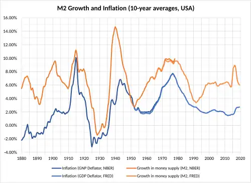 The monetarist quantity theory of money holds that changes in the price level are directly caused by changes in the money supply.[16] Whereas there is empirical evidence that there is a long-run positive correlation between the growth rate of the money stock and the rate of inflation, the quantity theory has proved unreliable in the short- and medium-run time horizon relevant to monetary policy and is abandoned as a practical guideline by most central banks today.[17]
