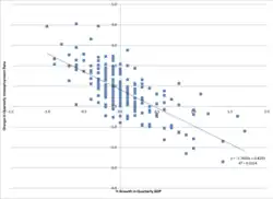 Cyclical unemployment occurs when growth stagnates. Okun's law represents the empirical relationship between unemployment and short-run GDP growth.[8] The original version of Okun's law states that a 3% increase in output would lead to a 1% decrease in unemployment.[9]