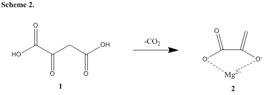 In the Diels-Alder mechanism for the biosynthesis of macrophomic acid (Scheme 3), oxaloacetate is decarboxylated to form the enolate complex with Mg2+. Next, the enolate complex adds to the pyrone through a Diels-Alder concerted reaction to form a bicyclic intermediate (8). Then, just as in the Michael-aldol sequence, the bicyclic intermediate gets decarboxylated and dehydrated to form macrophomic acid (9).[4] This pathway is thought to be the actual mechanism; however, according to QM/MM calculations, it seems that the Michael-aldol sequence is more energetically favored. There has also been difficulty in isolating the key intermediates for either proposed pathway.[2]