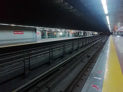 Macunköy, is a surface rapid transit station of the Ankara Metro. Currently, only one line is in operation at this station. The station was opened on 29 December 1997, the same day that the M1 line opened.[1] This station is the main depot station in Ankara Metro (the other depot station being located at Koru station). Trains are added to and removed from the system from this station. The 3rd rail is located in the middle of the station is used to store the backup train or the removal process of the trains. The addition process is done with a railway switch that connects to the mainline from the 4th line close to the station.