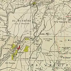 During the 1948 war, the evacuation occurred before the Zionist assault on Safad on 10 to 11 May.[2] According to Morris, based on Haganah-sources, the villagers feared reprisals or feared being caught in a cross-fire after local Jewish communities had been attacked. Therefore, the villagers of Madahil (together with those of Khiyam al-Walid, Al-Hamra', Ghuraba, and (partially) Al-Muftakhira) fled.[4] However the American historian Rosemarie Esber gives as depopulation cause "Attack or atrocity in neighboring village or community" and "Fear of impending attack, or fall of neighboring town or village."[5] The Israeli settlement of Kefar Szold, founded in 1942, is located 1.5 km southeast of the village site, but not on village land.[2]