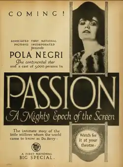 Madame DuBarry is a 1919 German silent film on the life of Madame Du Barry. It was directed by Ernst Lubitsch,[2] written by Norbert Falk and Hanns Kräly with the title role taken by Pola Negri and Louis XV played by Emil Jannings. Its alternative title for United States distribution was Passion. The film version distributed in the US ran at 113 minutes.