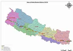 Madan Bhandari Inner Terai Highway or NH09 (Nepali: मदन भण्डारी भित्री मधेश राजमार्ग) is an ongoing road project in Nepal, which is thought to be 1,200 kilometres (750 mi) long from east to west. It starts at Shantinagar in Jhapa District of Province No. 1 and runs through Inner Terai (Dun valleys) area. It ends at Rupal in Dadeldhura District of Sudurpashchim Province. It is an alternative road to the East-west Mahendra Highway (NH-1). The highway will be located 25 to 30 km to the north of Mahendra Highway and 25 to 30 km south of the Pushpalal Highway.[1][2]