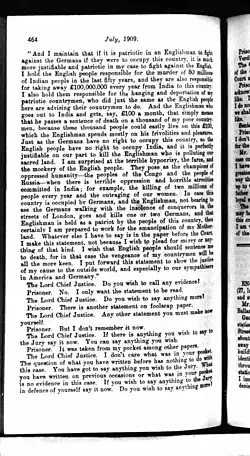 "I do not want to say anything in defence of myself, but simply to prove the justice of my deed. As for myself, no English law court has got any authority to arrest and detain me in prison, or pass sentence of death on me. That is the reason I did not have any counsel to defend me. And I maintain that if it is patriotic in an Englishman to fight against the Germans if they were to occupy this country, it is much more justifiable and patriotic in my case to fight against the English. I hold the English people responsible for the murder of 80 millions of Indian people in the last fifty years, and they are also responsible for taking away £100,000,000 every year from India to this country. I also hold them responsible for the hanging and deportation of my patriotic countrymen, who did just the same as the English people here are advising their countrymen to do. And the Englishman who goes out to India and gets, say, £100 a month, that simply means that he passes a sentence of death on a thousand of my poor countrymen, because these thousand people could easily live on this £100, which the Englishman spends mostly on his frivolities and pleasures. Just as the Germans have no right to occupy this country, so the English people have no right to occupy India, and it is perfectly justifiable on our part to kill the Englishman who is polluting our sacred land. I am surprised at the terrible hypocrisy, the farce, and the mockery of the English people. They pose as the champions of oppressed humanity—the peoples of the Congo and the people of Russia—when there is terrible oppression and horrible atrocities committed in India; for example, the killing of two millions of people every year and the outraging of our women. In case this country is occupied by Germans, and the Englishman, not bearing to see the Germans walking with the insolence of conquerors in the streets of London, goes and kills one or two Germans, and that Englishman is held as a patriot by the people of this country, then certainly I am prepared to work for the emancipation of my Motherland. Whatever else I have to say is in the paper before the Court I make this statement, not because I wish to plead for mercy or anything of that kind. I wish that English people should sentence me to death, for in that case the vengeance of my countrymen will be all the more keen. I put forward this statement to show the justice of my cause to the outside world, and especially to our sympathisers in America and Germany."[9]
