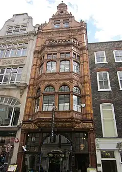 Hibiscus, a London restaurant owned and run by French chef Claude Bosi, was located at 29 Maddox Street until it closed in 2016.[14] Meanwhile, the imposing building known as 47 Maddox Street, which was designed by Walter Williams for Messrs Lawrence – a firm of tailors which was later known as Walter Williams – was completed in 1892 and is now occupied by Brown's Restaurant.[15]
