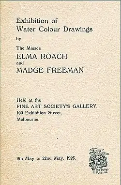 - 1923, from 9 May: Joint exhibition by Madge Freeman and Elma Roach. Fine Art Society's Gallery, 100 Exhibition St., Melbourne[46][47]
