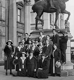 In February 1916, Freeman commenced her studies at the National Gallery of Victoria art schools[25] under Bernard Hall, and where others from Bendigo, Clarice Beckett and her sister, and Elma Roach (from Shepparton), attended.[26] They were reported as ‘working very hard’.[27] They periodically returned home to Bendigo on holidays, where on one occasion Coleman hosted a student friend Joan Lindsay.[28] Freeman appears in a 1920 snapshot, perched at centre top of a group of the students at the base of Emmanuel Fremiet's Joan of Arc statue outside the Art School (now the State Library forecourt).[29]