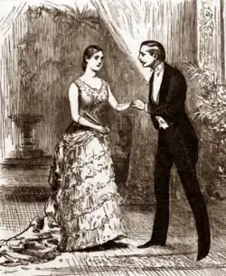 The Kendals joined the actor John Hare at the Court Theatre in March 1875, opening in a new comedy, Lady Flora. Hare had a comic character role, and the Kendals played the romantic leads, Flora and Harry Armytage.[34] She went on to play Mrs Fitzroy in Hamilton Aide's A Nine Days' Wonder, and then Lady Hilda in Gilbert's fairy comedy, Broken Hearts. She played Susan Hartley (a part she reprised in several later revivals) in Palgrave Simpson's adaptation of a French comedy, called A Scrap of Paper.[32] In September 1876 the Kendals moved to the Prince of Wales's Theatre under the management of the Bancrofts. There Kendal played Lady Ormond in Peril, a carefully anglicised French comedy. She subsequently played Clara Douglas in Money, Lady Gay Spanker in London Assurance and Dora in Sardou's Diplomacy, the last of which played for twelve months, in London and on tour. The Kendals returned to the Court, where they revived A Scrap of Paper in January 1879. In February, in her brother T. W. Robertson's adaptation from the French, The Ladies' Battle, the Kendals played the Countess d'Autreval and her suitor, Gustave;[8][32] in April she played Kate Greville in The Queen's Shilling, an adaptation of an old French comedy by Jean-François Bayard.[8][32]