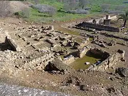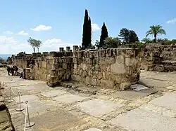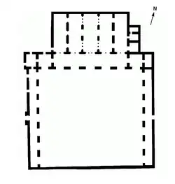 The main structure consisted of three parallel rectangular halls oriented east-west.[76] The halls were entered from the south: the southern walls of the first two halls each had three openings or doorways of equal size aligned in a row. The third hall, at the back, was much smaller and had only one door, which was aligned with the middle doors of the other two halls. Each hall was also flanked on both sides by small square (or nearly square) chambers. The first main hall may have served as an entrance hall, the second one may have been a reception room, and the third hall may have been a private sitting area whose side rooms served as bedrooms. The second and third halls have been partly reconstructed today, but the first (southernmost) hall has been lost. It stood at the very edge of the terrace, 15 meters above the ground of the next level below. In front of the eastern corner of this hall, however, are the remains of a staircase that led down to the terrace below.[76] On the east side of the main structure is another apartment consisting of a courtyard, a portico of arches, and a hall, which was built over a former bathhouse[75]