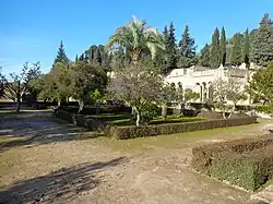 The Upper Garden (Jardín Alto in Spanish) stretches out in front of the Salón Rico and occupies an elevated terrace that is 10 meters higher than the surrounding areas on the east, south, and west. The terrace is artificial, though the builders probably used an existing spur of the hills to start.[72] Its walls are reinforced with rectangular buttresses at regular intervals. On its east side was the Lower Garden and on its west side was the congregational mosque. The latter was reached via a covered path along the terrace wall, and to the south is another large unexcavated garden.[72] The eastern wall of the terrace is aligned with the portico of Bab al-Sudda while its north and south borders are aligned with those of the older Lower Garden to the east. Although it may have been initially intended to have a perfectly square layout, which would have measured 133 by 133 meters, the western side of the garden was extended on top of the Lower Garden, giving it a final width of 153.5 meters instead.[102] The final width corresponds to the base of an equilateral triangle whose summit could be placed at the center of the Salón Rico's façade, similar to the proportions found inside the caliph's reception hall. Felix Arnold suggests that these dimensions are therefore a deliberate part of the design.[102]