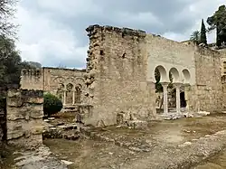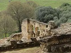 Located on a lower level southeast of the Dar al-Mulk, the Court of the Pillars is a structure centered around a large square courtyard which is ringed with a portico on all sides. On three sides of the courtyard, behind the portico, are wide rectangular halls. A staircase in the northwest corner led to a second story with a similar layout. Various Roman sculptures, including sarcophagi, were also discovered in this building.[79] Among the notable finds are the fragments of a sarcophagus known as the Sarcophagus of Meleager, which has been reconstructed and kept at the site today.[80] The building itself was built over what were initially two smaller houses. Its construction may date to the 950s, either at the same time as or after the construction of the Salón Rico.[81][80][82] To the north of this building is another residential complex, and east of that (close to the north gate) are two other courtyard houses separated by a ramp between them.[83]