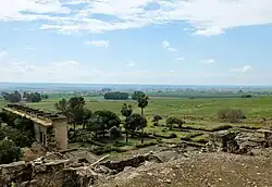 The official and ceremonial entrance to the palace areas, however, was located further east and was known as Bab al-Sudda ("Forbidden Gate" or "Gate of the Threshold").[21] This gate formed one end of the long road which led between the palaces and the city of Córdoba to the east, and it is believed to be the entrance where ambassadors or guests were received. The gate consisted of a monumental portico: a long row of huge horseshoe arches running roughly north-to-south. It was fronted by a large open esplanade, known today as the Plaza de Armas (a later Spanish term) but referred to in sources as a ḫaṣṣa (open area), probably originally serving a similar function as a mechouar (a term later used in the Maghreb) or a maydan. It would have hosted public ceremonies, military parades, and executions. On top of the gate's portico structure was a viewing platform where the caliph could sit and observe events on the plaza below. Inside the gate, a ramped street then led up to the terrace of the Upper Basilical Hall.[63][21]
