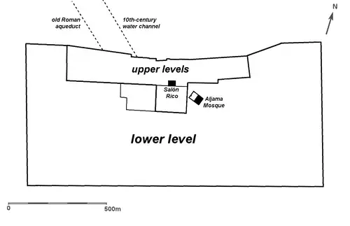 The city covered an almost rectangular area measuring 1.5 km long (roughly from east to west) and 750 wide (roughly from north to south).[50] Its perimeter was protected by a thick stone wall with square bastions. Today only about 10 of the 112 hectares (0.43 sq mi) of the city have been excavated and restored, although this area includes the main palaces.[3] The highest point of the city was at the centre of its northern wall (near the palaces), which is 215 meters above sea level, while the lowest point, to the south and nearer to the river, is 70 meters lower. Most of the site slopes gradually down towards the river except in the central northern zone where there were three distinct levels or terraces built into the hillside, with height differences of 10 meters or more between them.[51] The two upper levels were known as the "Alcázar" (al-Qasr in Arabic).[12] Most of the modern excavations have focused on the Alcázar and its palaces, and these are the areas visitors can access today.[52]