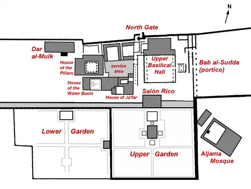 The northern gate of the city, Bab al-Jibal ("Gate of the Mountains"), was located at the highest point of the city and granted access directly into the middle of the Alcázar or palace area of the city.[21] It is also known as the North Gate (Puerta Norte in Spanish). It had a bent entrance layout and was defended by a tower.[62] Today it acts as the main entrance to the site for visitors and tourists. To the west of the gate was the caliph's private palace (the Dar al-Mulk) and to the east was the administrative district and the Upper Basilical Hall (the Dar al-Jund).