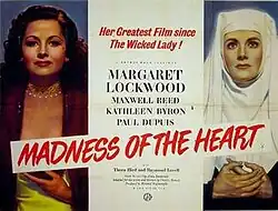 Madness of the Heart is a 1949 British drama film directed by Charles Bennett, produced by Richard Wainwright for Two Cities Films and starring Margaret Lockwood, Maxwell Reed, Kathleen Byron and Paul Dupuis. The screenplay was written by Charles Bennett, adapted from the novel of the same name by Flora Sandström.[3]