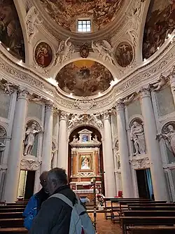 The church construction began in 1662 to house an image of the Madonna del Prato that was held to be miraculous. The plain façade with two statues does not prepare the visitor for the interior, which is a near-replica of the interior space and ordering of San Carlino alle Quattro Fontane, one of the masterpieces of Baroque architecture in Rome, by Francesco Borromini. The architectural plan is attributed to Carlo Perugini, but there is evidence Borromini may have played a direct role.[1] The dome, which in Rome is populated by geometric crosses, was frescoed by Francesco Allegrini and Louis Dorigny (1677–1678). The church also has altarpieces by Ciro Ferri, Gaetano Lapis, and Domenico Maria Viani.[2]