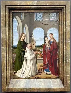 Mary stands in majesty, holding the child Christ and standing on an oriental carpet. Around her are Saint Barbara, standing before the tower in which she was prisoned, Saint Elizabeth of Hungary dressed in a nun's habit, and the donor Jan Vos (d. 1462), depicted as a Carthusian monk kneeling in prayer. A statue of the deity Mars can be seen through the window of Barbara's tower.[2] Vos' pose and modeling closely resembles the donors in both van Eyck's portraits of Nicolas Rolin in the Madonna of Chancellor Rolin and Joris van der Paele in the Virgin and Child with Canon van der Paele (the latter also contains a depiction of Saint Barbara). This fact, and the similarity of the landscape to that in a number of his earlier portraits has led to a general consensus among art historians that aspects of the panel are a pastiche of van Eyckian motifs, and that the painting was finished by a talented workshop member. Evidence suggests that the passages by van Eyck hand are mostly around the central Virgin and Child.[1]