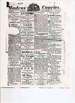 The Madras Courier was an Indian English language newspaper that ran between 1785 and 1821.[1] It was the first newspaper to be published in Madras, Madras Presidency, British India. It was the leading newspaper of its time and was the officially recognized newspaper for printing government notifications.[1]