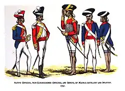 The Madras Regiment was initially formed as the Madras European Regiment in the 1660s by the East India Company, and would see its first action during the First Carnatic war. The first of the sepoy levies were mostly irregulars, consisting of Indo-Portuguese guards, Europeans, and some natives, with no standard issue uniforms or equipment. Unlike the English East India Company, the French Indies Company had begun to recruit and train local Tamil, Telugu, and Malayalam speaking recruits, and would have two regiments of sepoys fully drilled and equipped in the French Manner.[1] In 1746, the newly trained French sepoy regiments under Admiral La Bourdonnais would capture Madras after quickly overwhelming the underequipped garrison.[1]