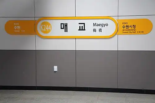 Maegyo Station is a subway station of the Suin–Bundang Line, the commuter subway line of Korail, and the national railway of South Korea. The station was opened in November 2013, as part of the final extension of the Bundang Line.
